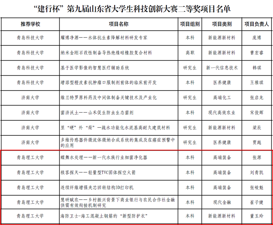 近日,山东省教育厅主办的“建行杯”第九届山东省大学生科技创新大赛决赛落下帷幕,经过激烈角逐,我校建筑与城乡规划学院项目《装配式乡村儿童智能书屋》、机械与汽车工程学院项目《3D打印创“视”界-新一代透明电子领创者》、管理与工程学院项目《安伴君——国内首创便捷式智能越障轮椅》荣获一等奖。