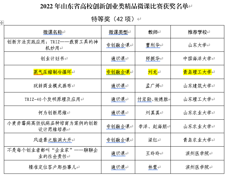 近日,山东省高校创新创业类精品微课比赛结果揭晓,我校环境与市政工程学院刘龙老师提交的“蒸气压缩制冷循环”荣获特等奖、刘国丹老师提交的“空调房间的空气分布器”荣获一等奖,是我校创新创业类课程资源建设的又一佳绩。