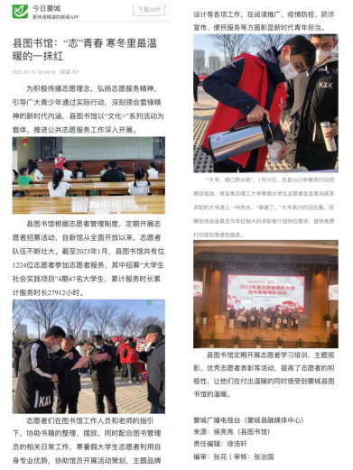 今年冬天蒙城县的志愿服务岗位上,多了这样一位积极、热情的年轻小伙子的身影。他是我校土木工程学院土木222班团支书岳金昊同学,他积极响应学校号召,在“安徽省社会科学知识普及基地”——蒙城县图书馆,参加志愿服务工作,在阅读推广、疫情防控、防诈宣传、便民服务等方面彰显了新时代青年担当。岳金昊同学在志愿服务期间表现突出,他优秀的志愿服务工作表现被蒙城电视台作为优秀典型进行了报道,展现了学院学子积极参与志愿服务工作、乐于奉献、挺膺担当的良好风貌。