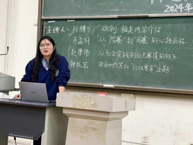 孙腾飞介绍了“双创”相关内容,围绕“什么是大学生学科竞赛”“为什么要参加大学生学科竞赛”“具体赛事有哪些”以及“赛程安排与答辩要求”四个方面进行介绍,使在场学生对“双创”有了基础的认识,激发同学们的科创兴趣。马孟珂围绕“互联网+比赛章程”“案例分析”和“团队比赛章程”三个方面分享了自己从“院赛”到“国赛”的心路历程。她以团队成员为了提升汇报效果修改100多版PPT为例,强调团队成员要有团队精神,不怕麻烦、精益求精,才能呈现出优秀的作品。赵康伟围绕挑战杯红色专项赛事进行经验分享,从比赛简介、材料基础、实践方式、参赛经验四个方面,由浅入深地进行介绍,使在场学生加深了对红色专项赛事的认识。他强调小组成员应分工合作,各司其职,发挥所长。钟杭宏则着重介绍了红旅赛道概论、特点、成功案例、备赛方向等内容,鼓励广大同学结合专业特点和优势积极备赛,打造种子项目。