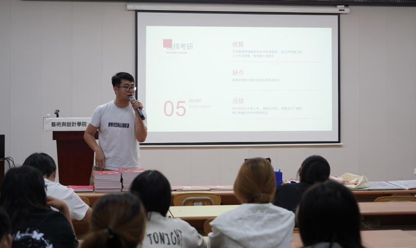 活动在关于创新创业实践竞赛的前沿资讯分享中拉开帷幕。学院特别邀请了在创新实践领域拥有丰富经验的研究生们作为嘉宾。学院研究生会主席团成员张玉、2023级研究生王硕、在全国数字艺术设计大赛荣获一等奖的杨真等同学围绕艺术与设计领域的热点创新实践议题,进行了深入浅出的剖析。