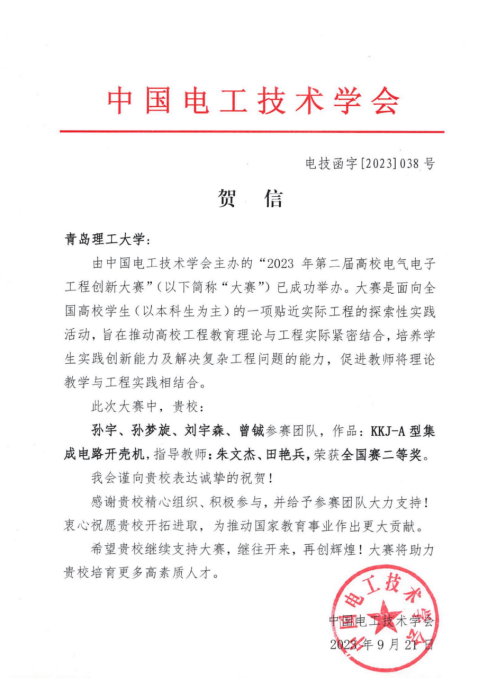 近日,第二届高校电气电子工程创新大赛全国总决赛圆满结束。我校信息与控制工程学院共有3支队伍参赛,“KKI-A型集成电路开壳机”项目为华东赛区唯一一个硬件赛道一等奖,并在全国决赛中获得二等奖。“多谐振控制双向功率流高频隔离逆变器地设计与实现”和“Lora低功耗检测抽油机温度噪声设备”分获华东赛区二等奖和三等奖。田艳兵、朱文杰老师被评为大赛优秀指导教师。