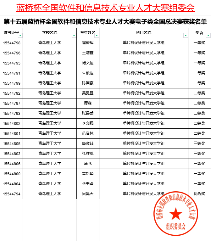 日前,第十五届“蓝桥杯”全国软件和信息技术专业人才大赛(软件类和电子类)全国总决赛成绩公布,我校学子共计获得一等奖5项、二等奖14项、三等奖19项、优秀奖13项。在今年的电子类总决赛中,我校只参加了单片机设计与开发一个赛道,该赛道共计66项全国一等奖,我校取得了5项,在山东省名列第一。