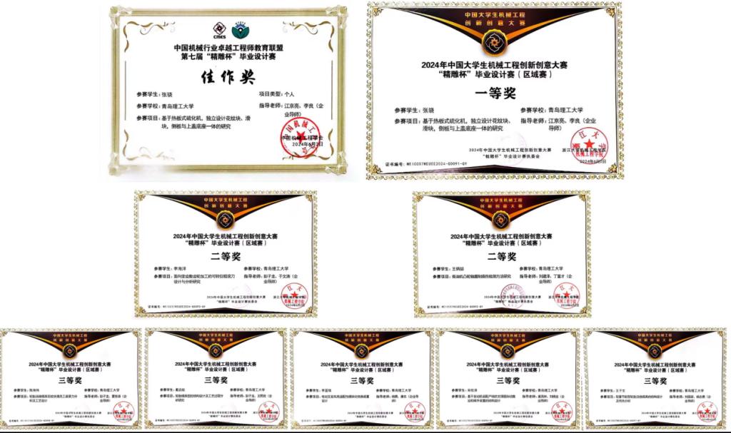 本届大赛以“全面提高人才质量”为宗旨,旨在推动高校机械工程专业教育和人才培养,激发大学生的创新思维和实践能力,促进和提升学生的综合素质。自2023年11月23日正式启动以来,大赛历经题目征集、题目评审、提交参赛作品、区域赛、总决赛等五个过程,共计收到来自清华大学等高校提交的1143项作品参赛。学校共计申报参赛22项,经函评、专家评审等环节,我校学生累计获得东北部赛区个人赛一等奖1项,二等奖2项,三等奖5项。其中,“一体式活络模具结构的研究及其工装设计”(学生:张骁,指导教师:江京亮,李良)获得东北部赛区一等奖;“面向变齿数齿轮加工的可转位粗滚刀设计与分析研究”(学生:李海洋,指导教师:彭子龙,于文涛)、“柴油机凸轮轴磨削烧伤检测方法研究及制定”(学生:王炳喆,指导教师:刘建泽,丁富才)获得东北部赛区二等奖;“轻量节能型轮胎活络模具的结构设计及传热分析”(学生:王子文,指导教师:刘国梁,杨志勇)、“轮胎模具型腔结构设计及工艺过程分析研究”(学生:戴启航,指导教师:彭子龙,张金辉)、“基于发动机装配产线的支撑腿自动搬运机械手装置的结构设计”(学生:宋欣泽,指导教师:姜芙林,刘晓龙)、“轮胎活络模具花纹块清洗工装受力分析及工艺设计”(学生:陈海伟,指导教师:彭子龙,夏世涛)、“1.5吨纯电动叉装车产品的设计研发(桥臂及驱动系统)”(学生:李蓝瑞,指导教师:杨勇,康东)获得东北部赛区三等奖。