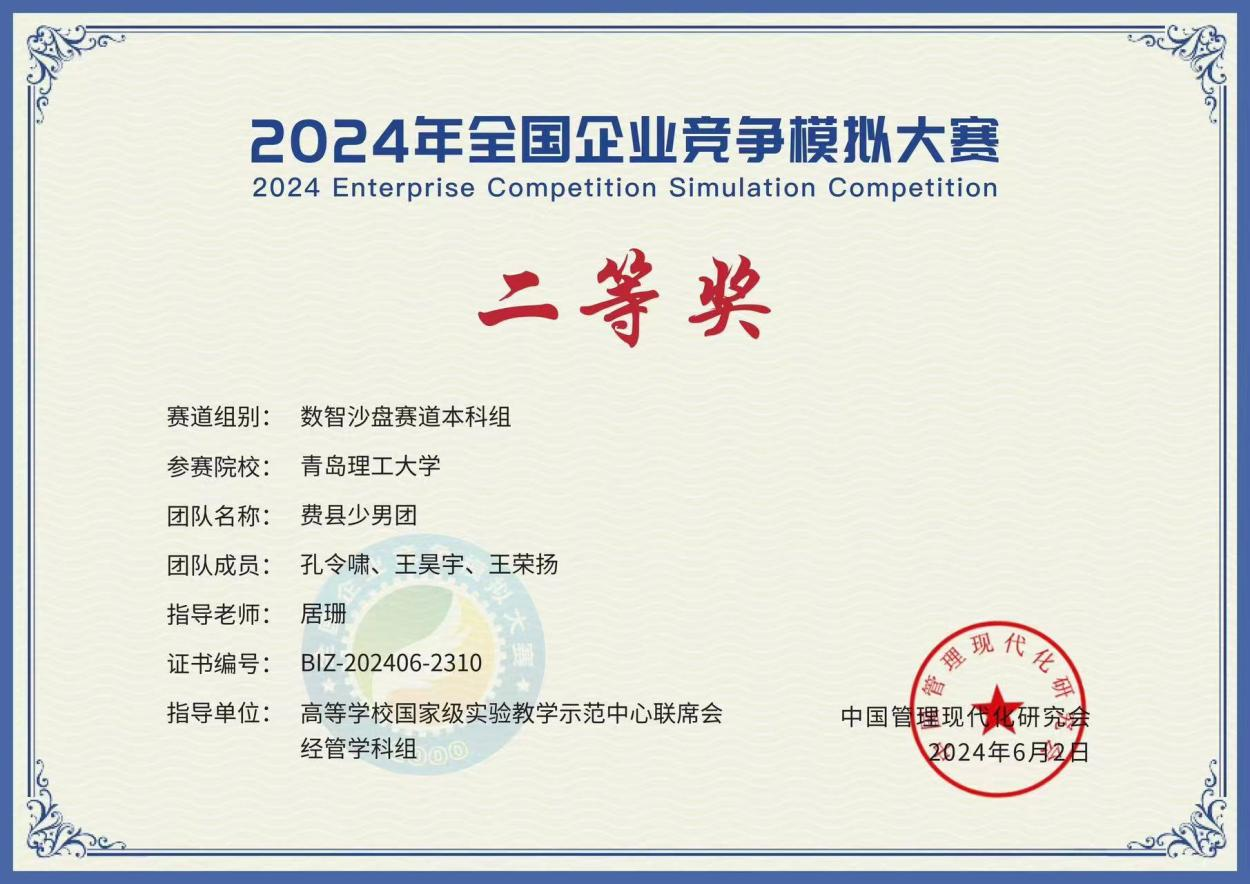本次数智沙盘赛道比赛以线上形式开展,共有244所学校984支队伍报名参赛,我校临沂校区“得喂队”队(队员:田欣、陈祥龙、訾笑蚺;指导老师:陈贞)获得全国一等奖,另有2支队伍(“勇敢向前冲”队,队员:徐铭阳、鹿含冰、李省震,指导老师:周成豪;“费县少年团”队,队员:孔令啸、王昊宇、王荣杨,指导老师:居珊)获得全国二等奖。