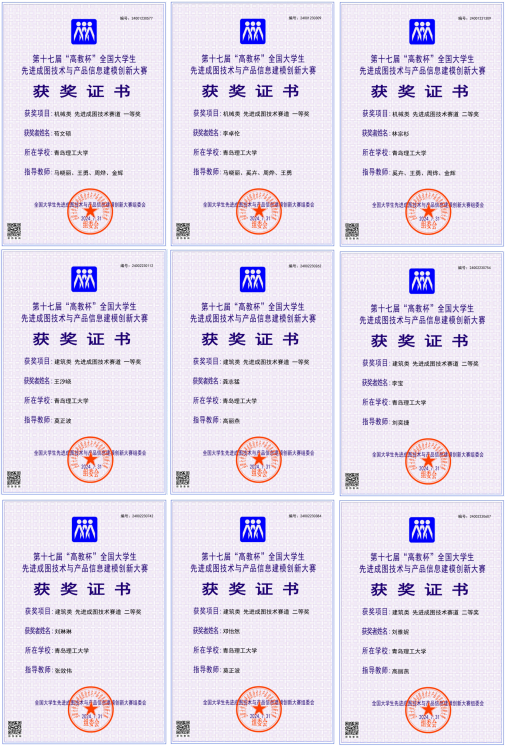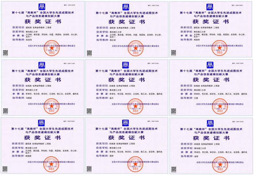 2024年7月26日至28日举办的第十七届“高教杯”全国大学生先进成图技术与产品信息建模创新大赛在贵州成功举办。在理学院制图教研室老师们的悉心指导下,我校学子在大赛中的成绩再创新高。共获得建筑类先进成图技术赛道一等奖2项,二等奖7项,三等奖5项,机械类先进成图技术赛道一等奖2项,二等奖2项,三等奖3项,建筑类团体二等奖,机械类团体三等奖。奖项获历史新高。张效伟、马晓丽、刘奕捷、莫正波、高丽燕、奚卉、王勇、周烨、金辉、杨登峰等老师获全国优秀指导教师称号。