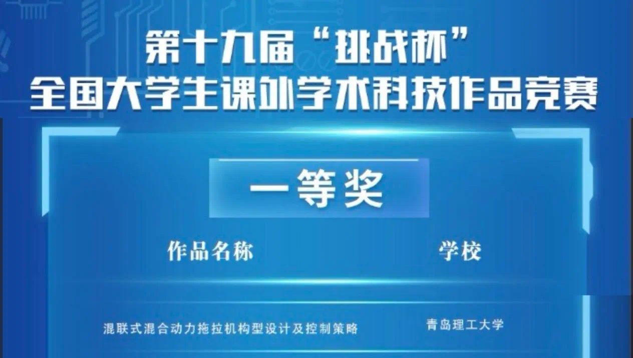第十九届“挑战杯”全国大学生课外学术科技作品竞赛“揭榜挂帅”专项赛终审决赛浙江场于11月15日至17日举办。经过激烈角逐,我院《混联式混合动力拖拉机构型设计及控制策略》项目(指导教师:李宝刚、李玉环;团队成员:潘金波、王祥、宋泉、刘恩汐、颜世斌、李贤、宋佳瑶)获全国一等奖!