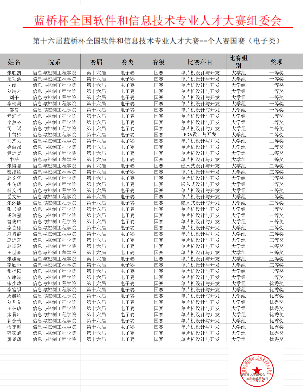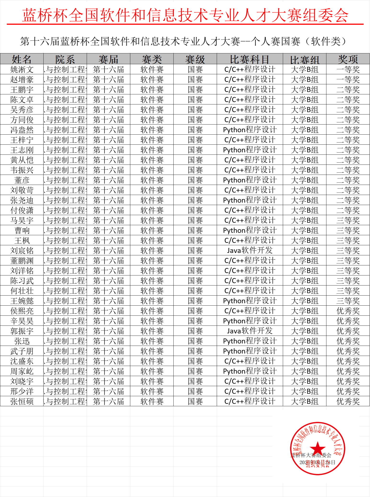 6月23日,第十六届“蓝桥杯”全国软件和信息技术专业人才大赛(软件类和电子类)全国总决赛成绩公布,我校学子共计获得一等奖9项、二等奖22项、三等奖27项、优秀奖20项,总计国赛获奖78项,获奖总人数较去年提高50%。